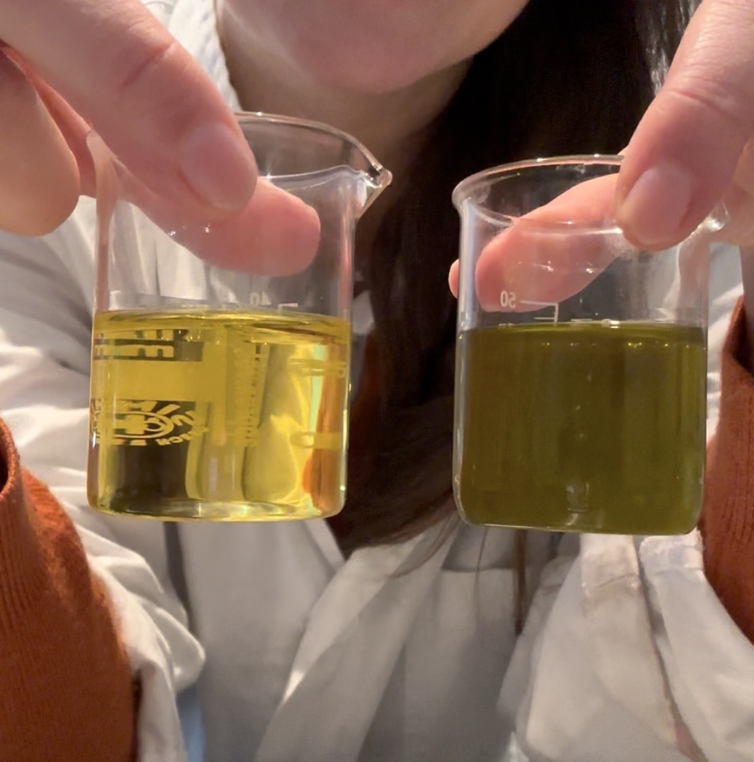 Camille, fondatrice de Siprès, a comparé une huile de bourrache chinoise à une huile belge. Sur la photo, l’huile chinoise est à gauche, l’huile belge à droite. L’huile belge dégage une odeur de céréale caractéristique de la bourrache, tandis que l’huile chinoise n’a aucune odeur. Cela peut sembler pratique pour fabriquer des cosmétiques, mais ce n’est pas la même qualité : une huile végétale qui a de la couleur et une bonne odeur est un vrai signe de richesse et de qualité.
