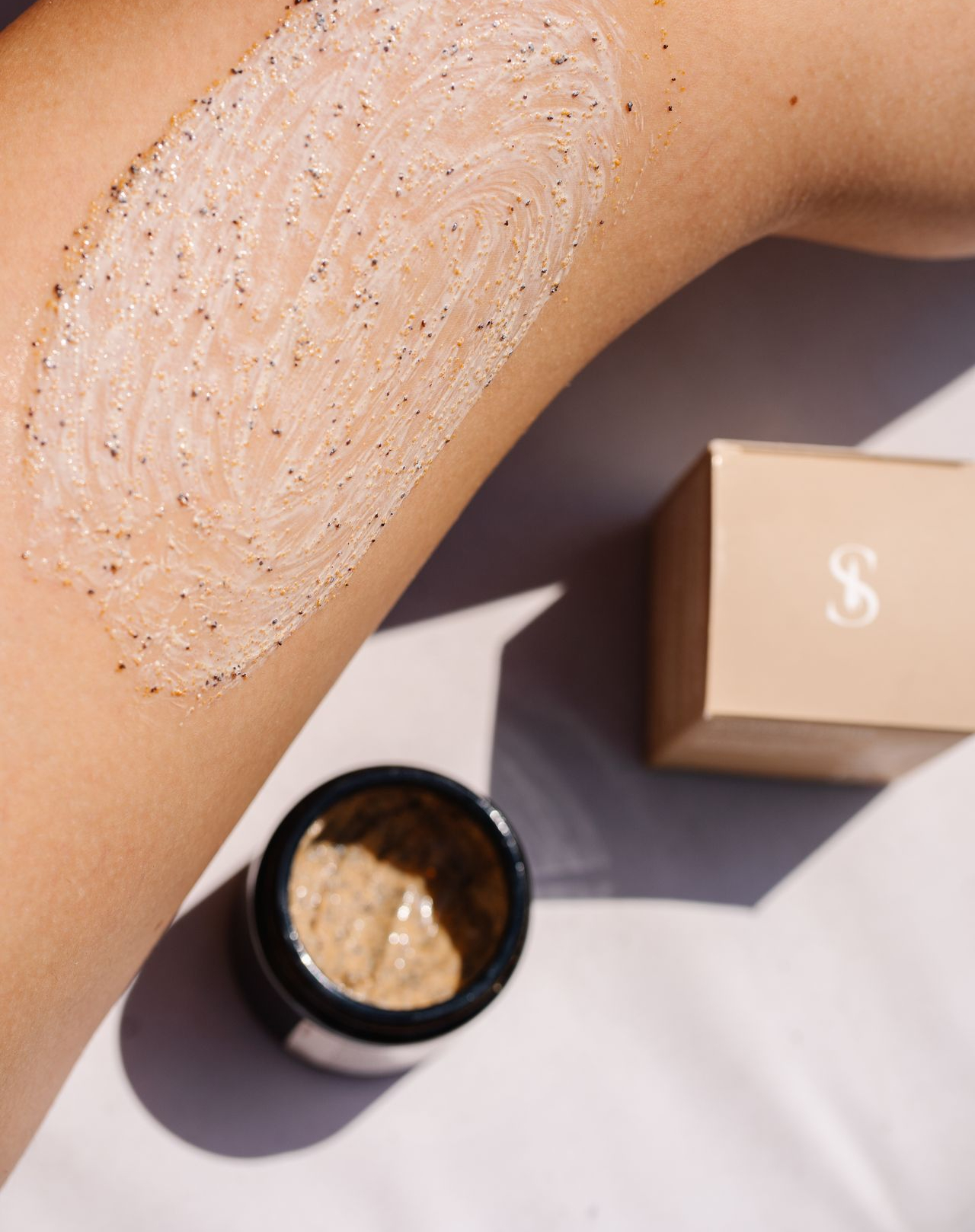 ✔ Appliquer une noisette sur peau humide, masser par mouvements circulaires sur tout le corps pour activer la microcirculation et exfolier en douceur